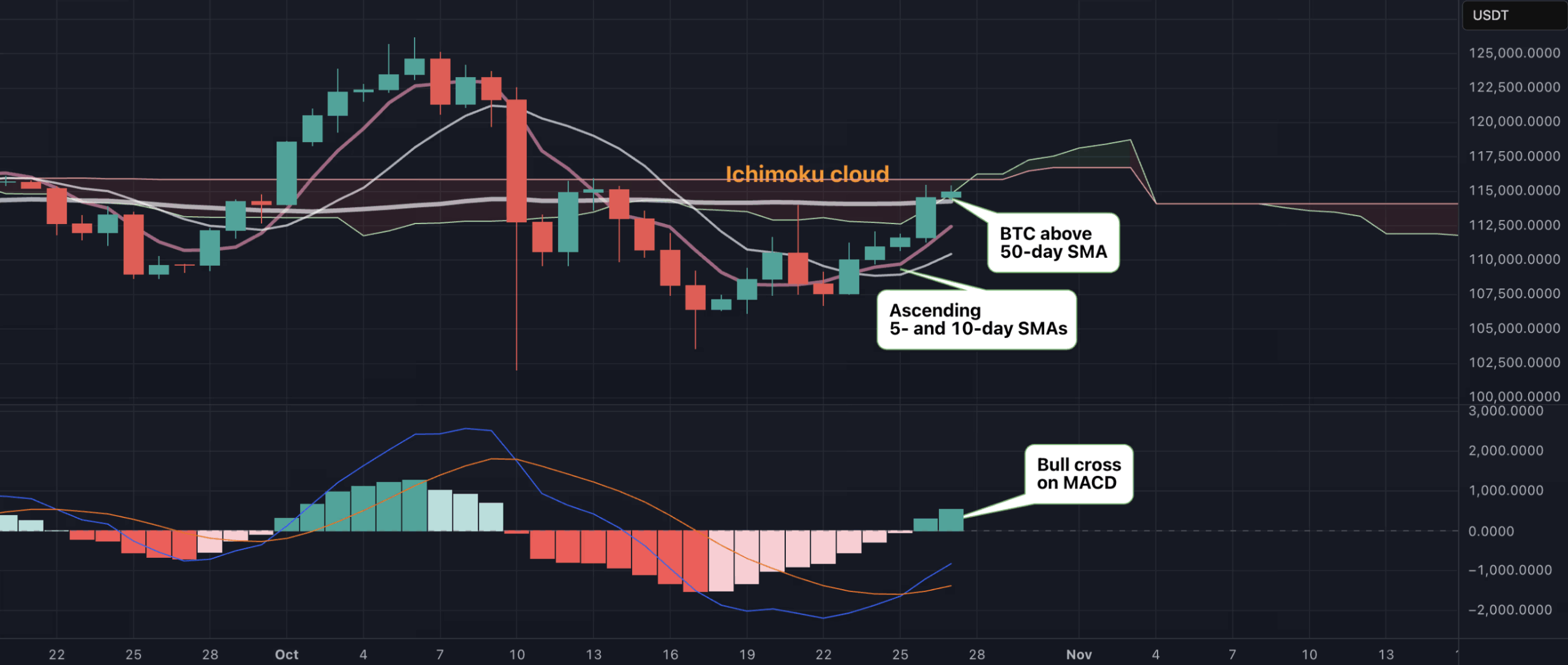 A pesar de que la recuperación a corto plazo de Bitcoin está respaldada por indicadores técnicos, el Indicador de Tendencia de Bitcoin de Coindesk continúa mostrando una perspectiva a la baja. Los analistas señalan que Bitcoin sigue por debajo de la nube de Ichimoku en el gráfico diario. Un cierre sostenido por encima de la nube podría fortalecer la tendencia alcista, posicionando el precio hacia el rango de los $120,000.