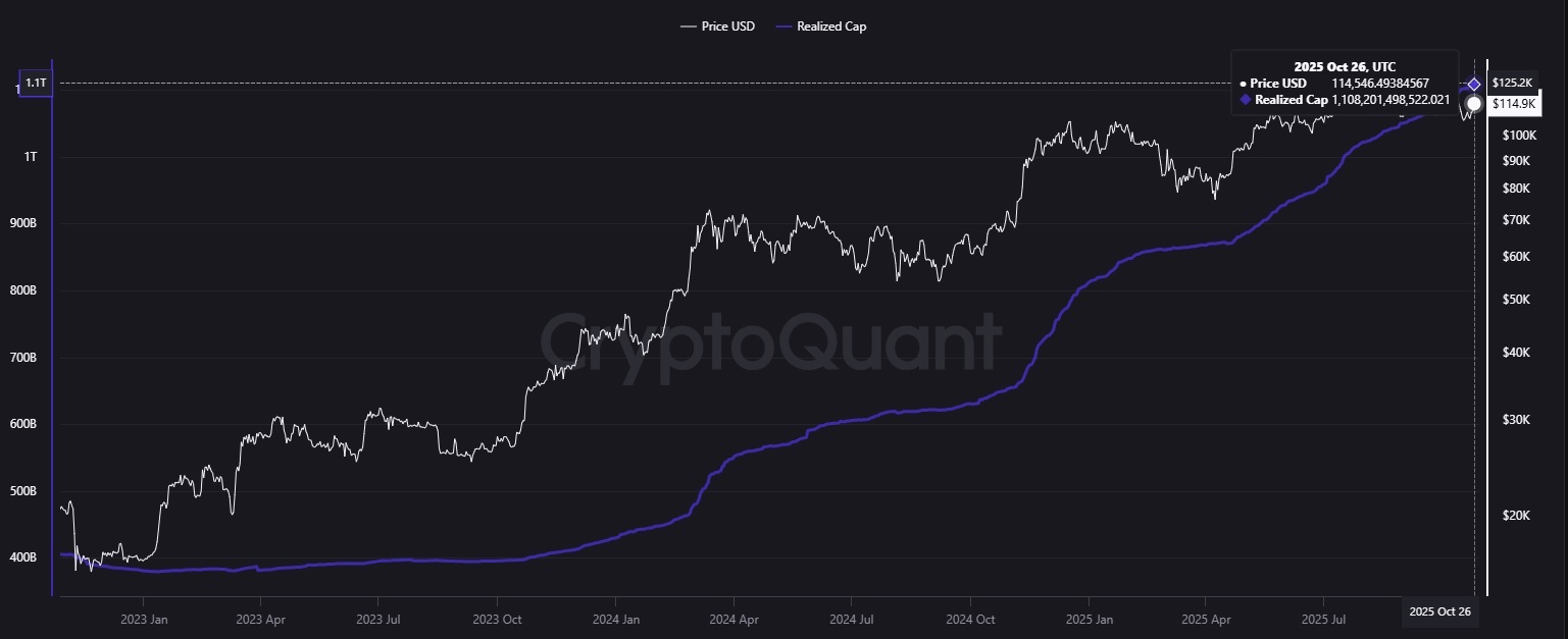 Eso lo atribuye a la capitalización realizada de bitcoin, métrica que mide el valor económicamente activo de BTC. Se encuentra en 1,1 billones de dólares actualmente, es decir, en máximos históricos, tal como se ve en la siguiente gráfica: