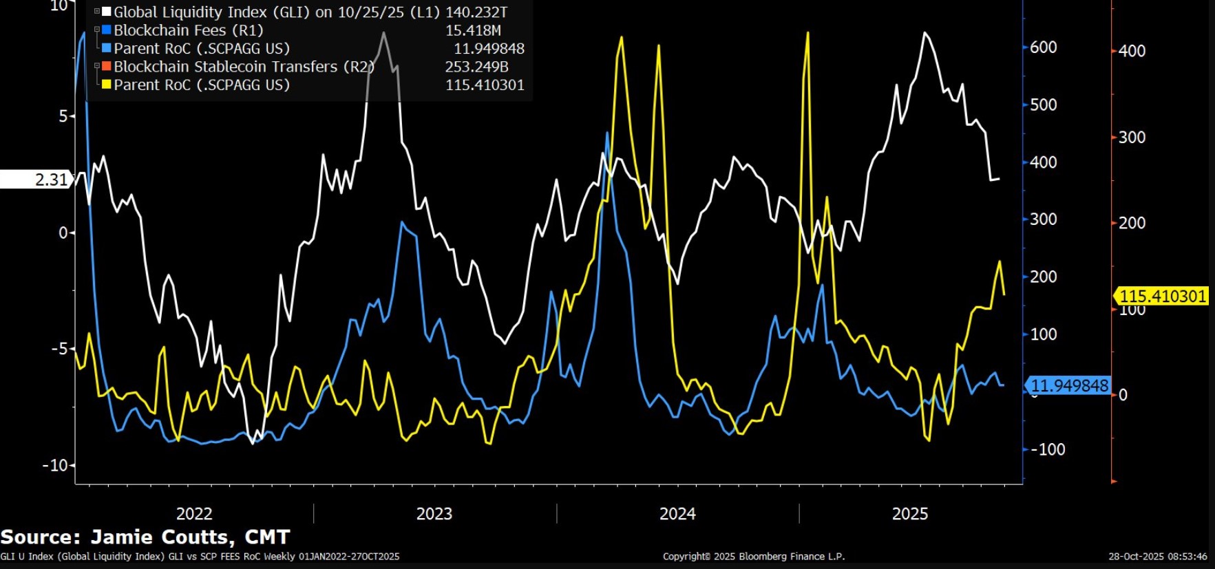 La siguiente gráfica compartida por Coutts refleja la evolución entre la liquidez global, las comisiones en redes descentralizadas y las transferencias con stablecoins desde 2022 hasta octubre de 2025.