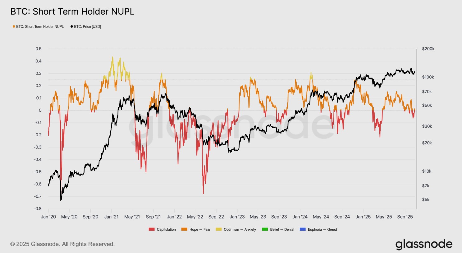 El análisis de Glassnode también apunta a un deterioro gradual en el sentimiento de los compradores de corto plazo. La métrica STH-NUPL (ganancias o pérdidas netas no realizadas de los tenedores a corto plazo) se ubicó recientemente en -0,05. Ese valor refleja pérdidas leves en comparación con las fases de capitulación de ciclos anteriores, cuando este indicador cayó por debajo de -0,2. Así se ve en el siguiente gráfico: