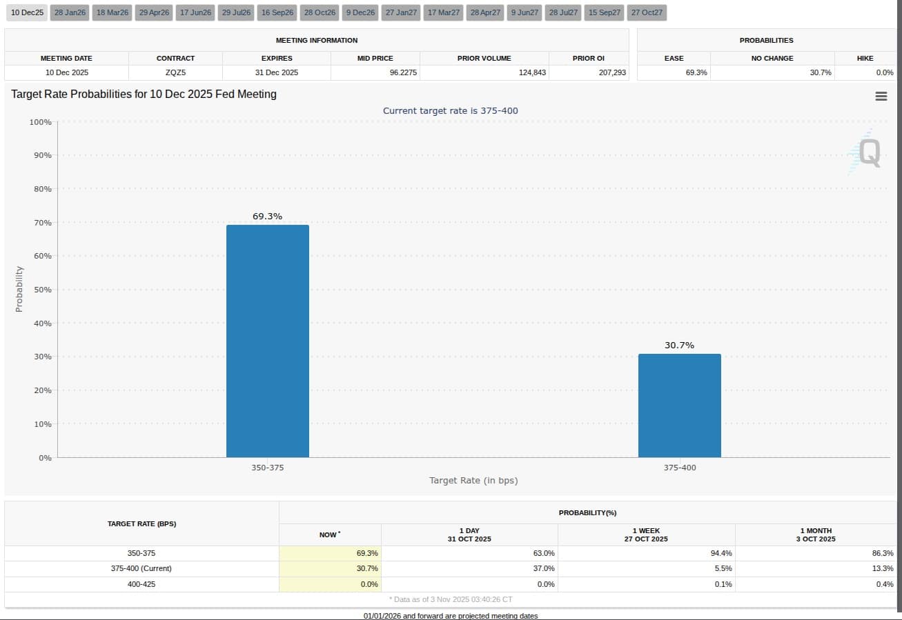 Los mercados accionarios se benefician de las esperanzas de un acuerdo comercial entre Estados Unidos y China, pero el bitcoin permanece al margen de esta dinámica. La correlación entre bitcoin y las acciones tecnológicas, antes fuerte, se debilita, aislando la cripto de los movimientos de los mercados tradicionales. Además, la Fed mantiene una postura restrictiva, con solo un 69,3 % de probabilidades de una reducción de tasas en diciembre.