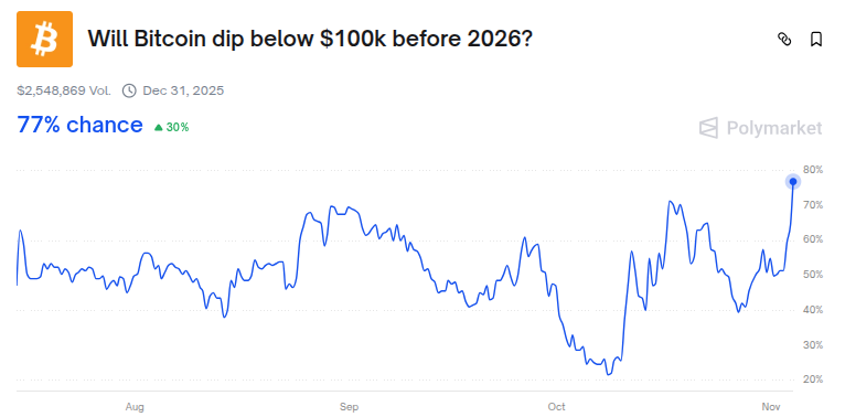 De acuerdo con Polymarket, más del 70% de los apostadores cree que BTC caerá por debajo de 100,000 dólares antes del 31 de diciembre de 2025.