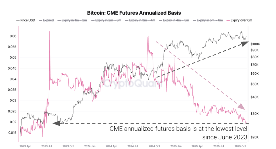 Las métricas en cadena de CryptoQuant destacan aún más una perspectiva bajista para el Bitcoin, ya que la demanda de inversores estadounidenses en el mercado de futuros de Bitcoin también está en niveles bajos. Esto es evidente en la tendencia descendente de la base anualizada de Futuros del CME, que ha caído a 1.98%, el nivel más bajo en más de dos años. Esta situación indica que la demanda de mantener futuros de Bitcoin con vencimientos de 6 meses o más es menor que en meses recientes y ha disminuido a medida que los precios al contado de Bitcoin se recuperaron de 80.000$ a 120.000$.