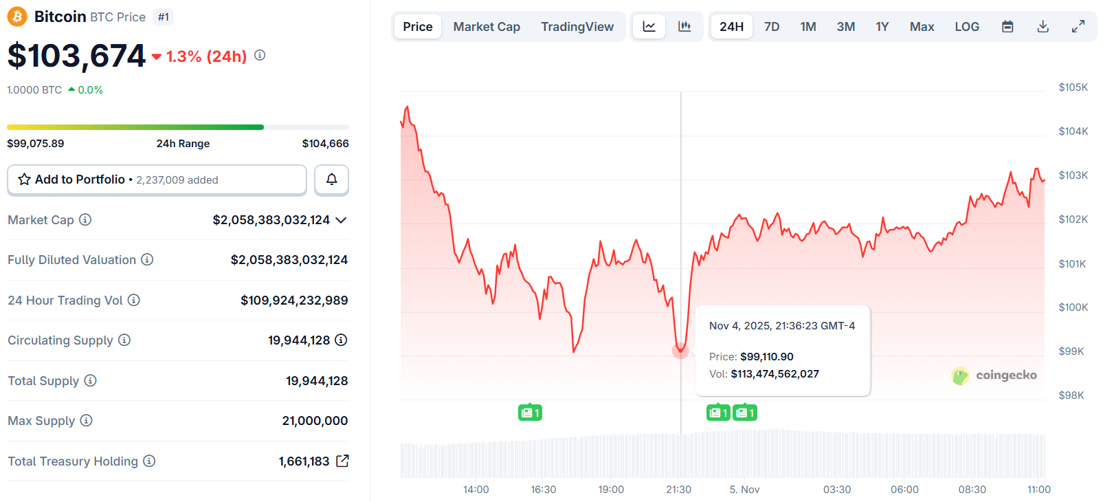 Los datos del mercado muestran que Bitcoin rebotó inmediatamente después caer por debajo de los USD $100.000, alcanzando un máximo diario de USD $103.674 el martes en horas de la mañana (ET) en medio de una recuperación modesta más amplia en el mercado; aunque aún con una disminución de 1,3% en 24 horas y 8% en la semana.