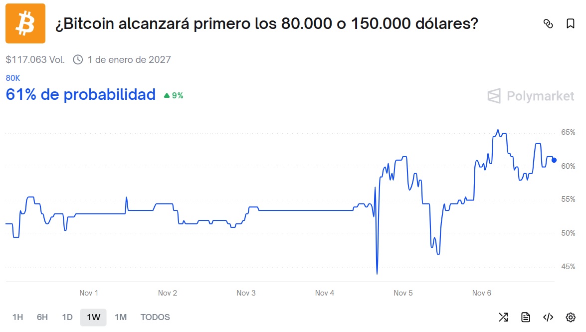 - En Polymarket, un contrato asigna más de 60% de probabilidad a la opción bajista.