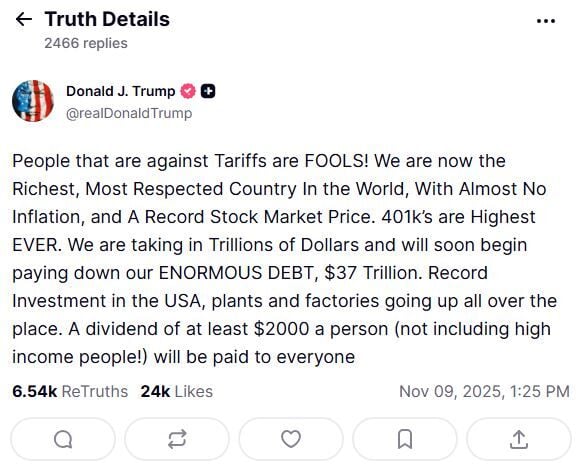 Este domingo en una publicación en Truthsocial el presidente de Estados Unidos, Donald Trump, anunciaba la entrega de un dividendo de 2.000 dólares para los ciudadanos estadounidenses provenientes de los excedentes generados por sus medidas arancelarias. Esto ha traído expectativas sobre el precio de Bitcoin (BTC), ya que ese capital podría ser invertido en criptomonedas.
