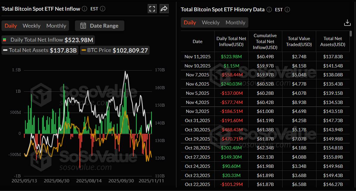 La demanda institucional de Bitcoin muestra algunos signos de recuperación. Según datos de SoSoValue, los ETFs de Bitcoin al contado listados en EE.UU. registraron entradas de 523,98 millones de dólares el martes, tras una leve entrada de 1,15 millones de dólares el día anterior, poniendo fin a la reciente racha de retiros que totalizaron 1,22 mil millones de dólares la semana anterior. Si esta tendencia de entradas se intensifica, podría proporcionar el impulso necesario para que Bitcoin extienda su recuperación de precios en curso.