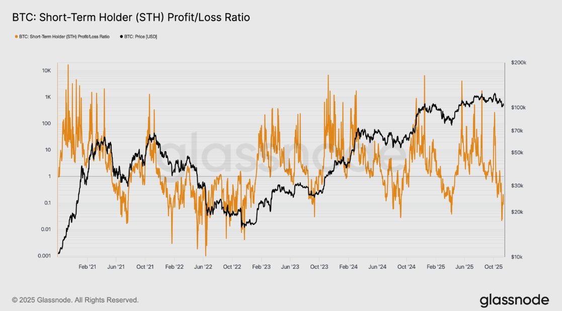 Como se muestra en el gráfico a continuación, el Bitcoin probó 98.000$, la relación de Beneficio-Pérdida Realizado de STH cayó por debajo de 0,21, sugiriendo que más del 80% del valor realizado provino de monedas vendidas con pérdidas. Esta intensidad de capitulación superó brevemente las últimas tres grandes liquidaciones de este ciclo, subrayando cuán pesada se ha vuelto el mercado y cuán crucial sigue siendo el nivel de 100.000$ para la estabilidad a corto plazo.