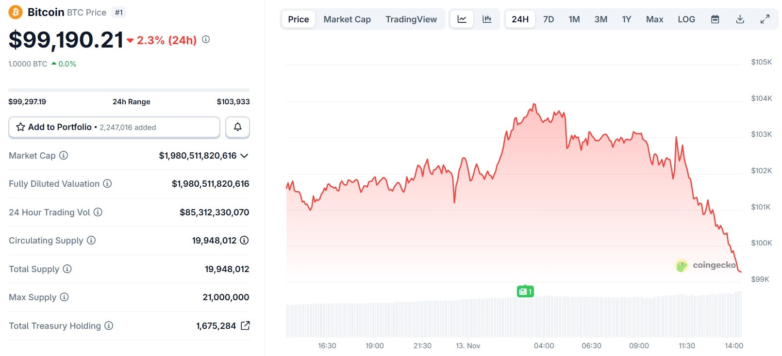 Al momento de redacción, el precio de BTC ronda los USD $99.200, según datos de CoinGecko, un 2,3% por debajo en las últimas 24 horas y una caída superior al 20% desde su máximo histórico de USD $126.000 alcanzado el mes pasado.