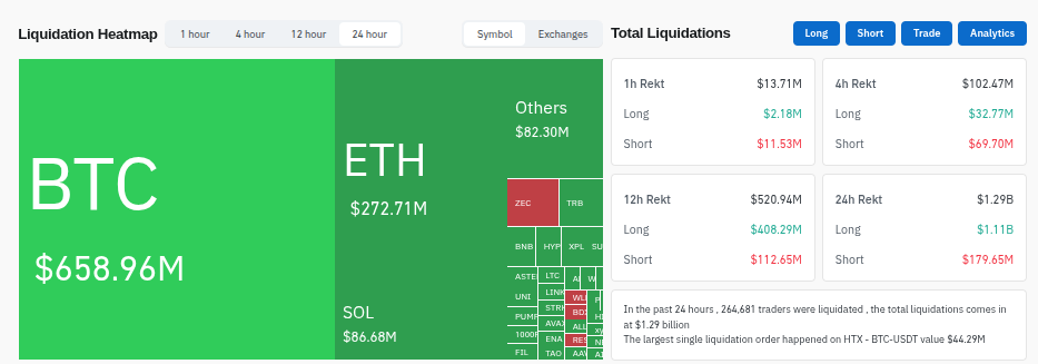 Datos de Coinglass destacan el efecto cascada de las liquidaciones en contratos apalancados, subrayando la fragilidad del mercado ante shocks externos. En las últimas 24 horas, 1,29 mil millones de dólares fueron liquidados del mercado cripto. De este total, 1,11 millones de dólares correspondieron a posiciones largas.