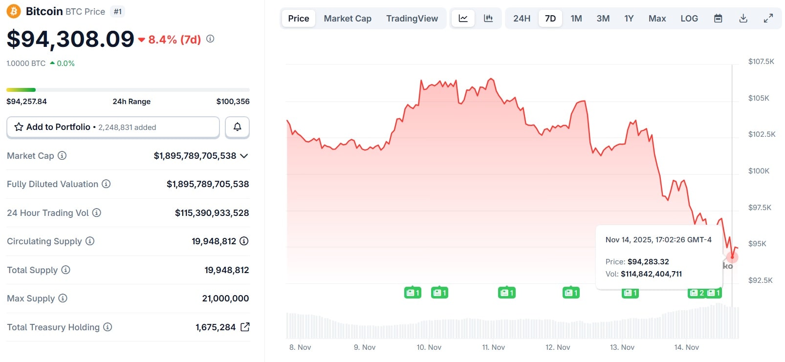 Bitcoin (BTC) registró este viernes por la tarde (hora del Este) un mínimo local de USD $94.257, nivel no visto desde mayo, lo que extendió la pérdida a casi 9% en la semana y consolidó el peor rendimiento semanal de la criptomoneda desde marzo.