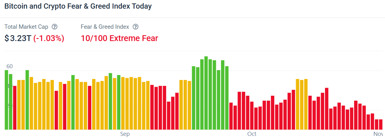 El índice de miedo y codicia en Bitcoin cayó hasta los 10 puntos (miedo extremo), en el descenso más severo desde mayo de 2022. En aquel entonces, el mercado cripto sufrió el impacto de la espiral de muerte de Terra. Ahora, el sentimiento vuelve a tornarse profundamente negativo para los inversores de esta moneda.