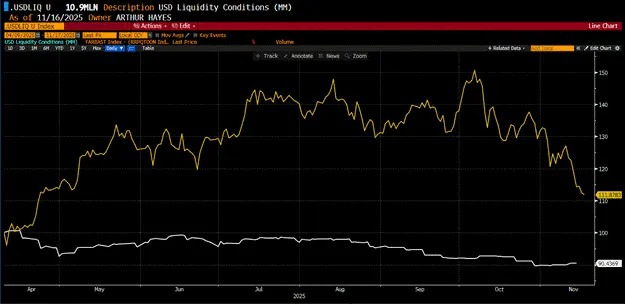 El capital que sale de los ETF de Bitcoin también está debilitando el sentimiento entre los inversionistas individuales. El descuento en estructuras de DAT, como la caída del valor de mercado de Strategy (MSTR) por debajo de su valor neto de activos, limita aún más la demanda institucional. Hayes afirma que el cese de los flujos de fondos hacia ETF y DAT ha eliminado los últimos factores que oscurecían el panorama negativo de la liquidez del dólar.