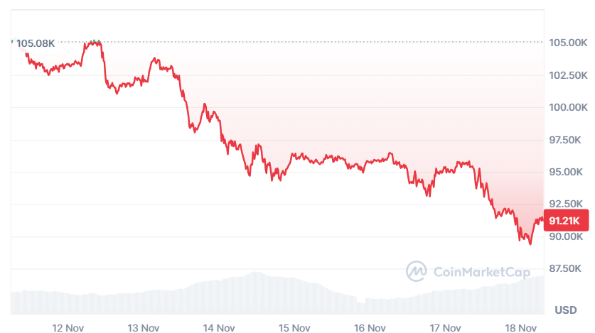 Al momento de redactar esta nota, el precio de BTC es de $91.200 por moneda, con un desempeño de -4,5% en 24 horas, según datos de CoinMarketCap. Mientras tanto, en el gráfico semanal el rendimiento se profundiza hasta el -13%. Se trata de números preocupantes, teniendo en consideración que las agudas caídas de BTC vienen desde el 10 de octubre.