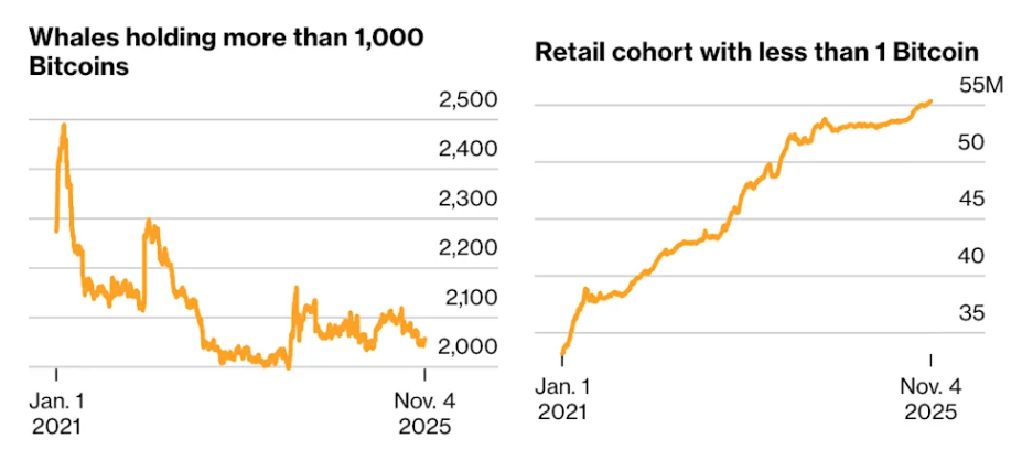 Pese a ello, el número de ballenas de Bitcoin con 1.000 BTC o más desciende, según un análisis de Citi citado por Bloomberg. De manera paralela, los inversores minoristas muestran una inclinación hacia las compras. Esto representa una situación inusual, dado que en contextos bajistas suelen ser los minoristas quienes lideran las ventas, mientras las ballenas absorben ese suministro.