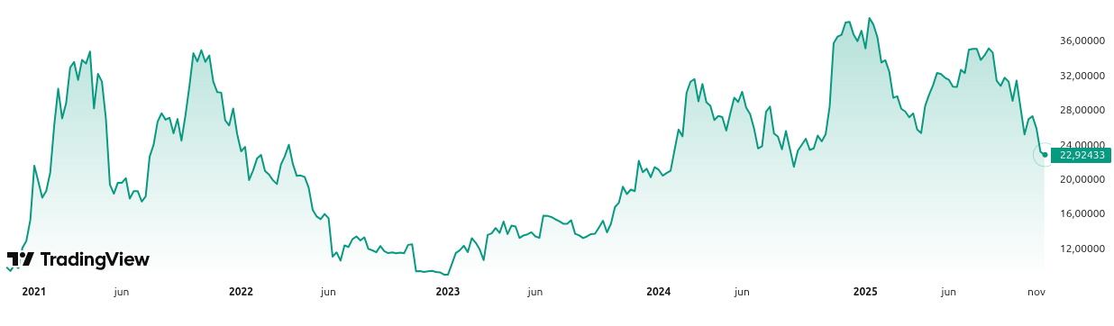 Actualmente, la relación BTC/XAU se sitúa cerca de 22.92, tras caer casi 28% desde su máximo. Esto señala un momento decisivo: perder este soporte podría revertir la tendencia de varios años, debilitando la racha alcista de BTC frente al oro.