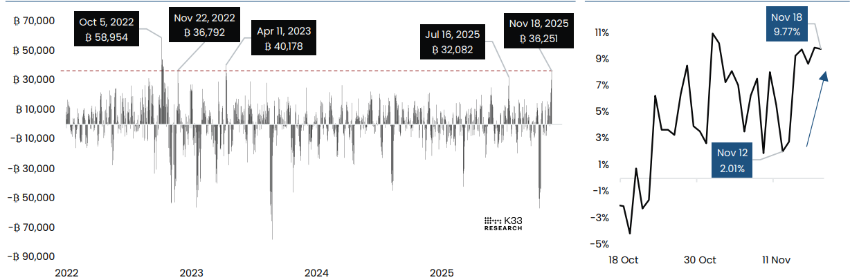 Los datos históricos muestran que en marzo de 2024, el BTC cayó un 33,57% desde su máximo histórico, mientras que la venta impulsada por tarifas en el primer trimestre resultó en una caída del 31,95%. Una disminución de magnitud similar hoy colocaría al BTC en el rango de 84.000–86.000$. Los analistas de K33 advierten que el resurgimiento del apalancamiento en el mercado de derivados podría ser el catalizador que arrastre los precios hacia estos niveles, o incluso más abajo.