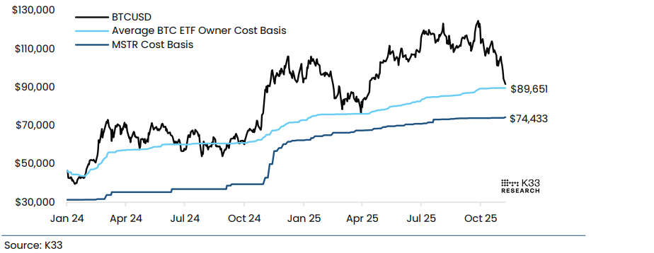 El gráfico a continuación muestra que el coste medio de los holders de ETF de BTC es de 89.651$, un umbral que Bitcoin rompió brevemente en su mínimo del martes de 89.183$. Durante la caída del primer trimestre, el BTC tocó fondo exactamente alrededor de este nivel medio de entrada de ETFs antes de iniciar una recuperación, convirtiéndolo en un área clave a observar una vez más.