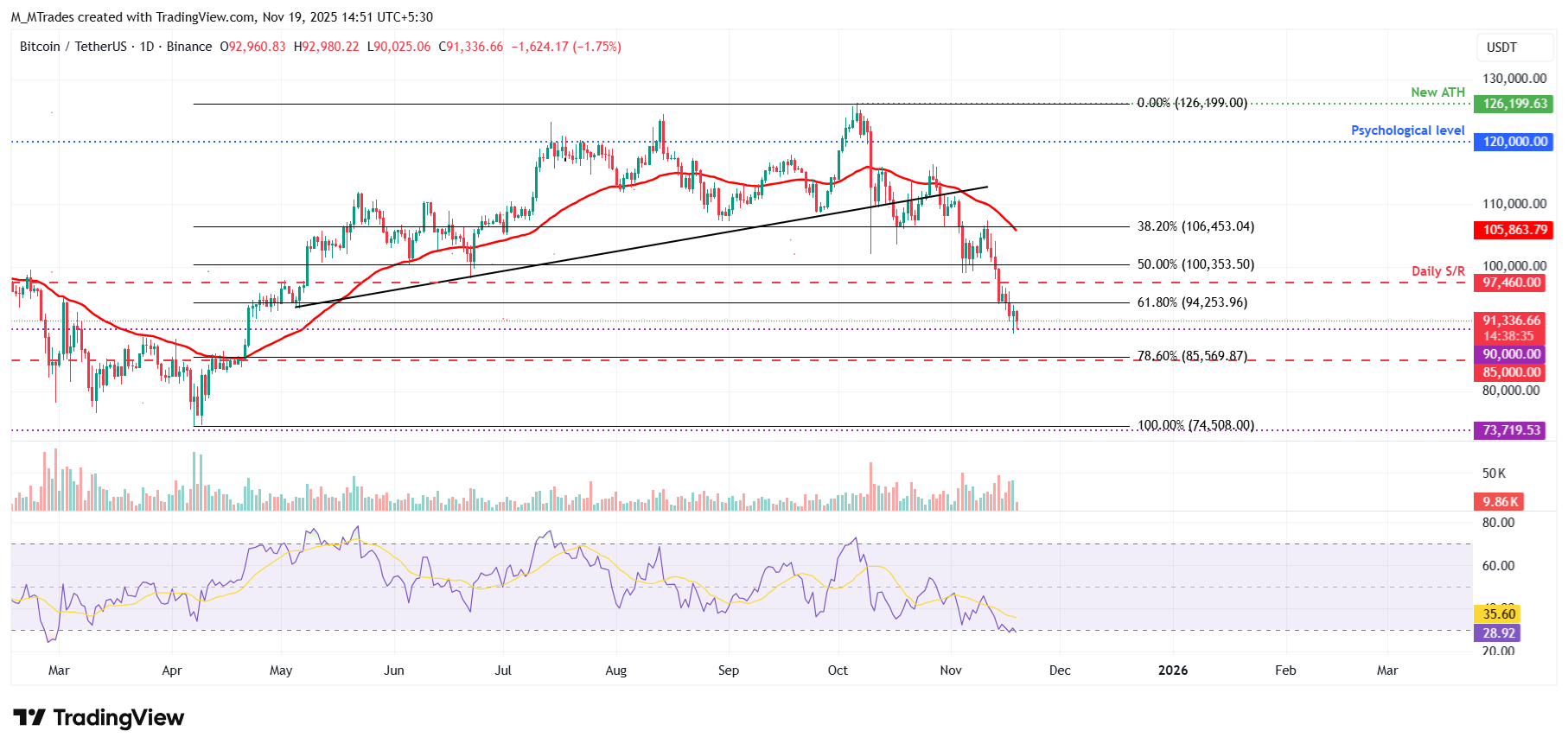 Si el nivel psicológico en 90.000$ continúa manteniéndose, el BTC podría extender la recuperación hacia el retroceso de Fibonacci del 61.8% en 94.253$.