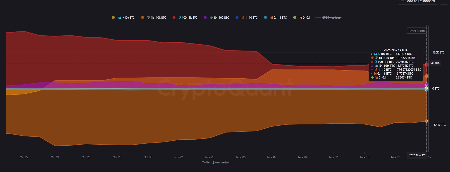 Un ejemplo de eso es que entre el 22 de octubre y el 17 de noviembre de 2025, las grandes ballenas (inversores con más de 10.000 BTC) duplicaron sus reservas, acumulando 41.912 BTC hasta ahora. Así se ve en el siguiente gráfico: