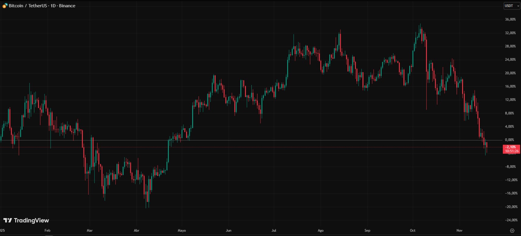 Como se aprecia, bitcoin ha corregido desde los máximos de más de USD 126.000 alcanzados hace poco más de un mes. El retroceso ha sido constante a lo largo de noviembre, con velas diarias predominantemente bajistas que muestran un deterioro progresivo del impulso alcista acumulado durante el año.