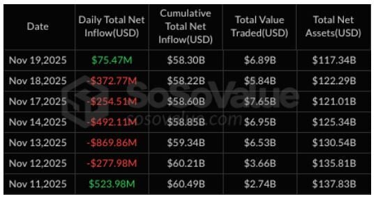 La entrada de capital de 75 millones de dólares registrada el 19 de noviembre representa la primera señal de estabilización y un posible punto de inflexión en el sentimiento del mercado. Con este repunte, las entradas netas acumuladas han vuelto a ascender a 58.300 millones de dólares, disipando la preocupación de que los inversores institucionales se estuvieran retirando del mercado.