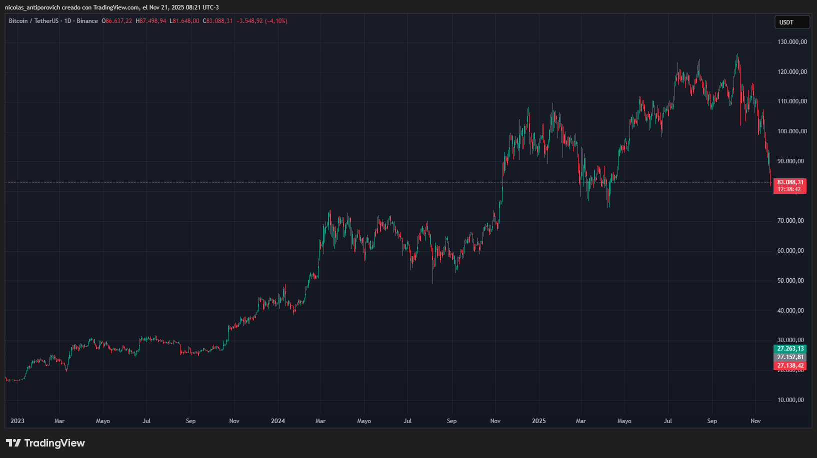 Pero esto no es una certeza sino, simplemente, una cuestión de probabilidades basada en patrones históricos. En el peor de los casos, si la presión de venta continuara superando a la demanda, bitcoin caería aún más, probablemente llegando a la zona de entre 70.000 o 75.000 dólares donde encontraría nuevos soportes históricos.