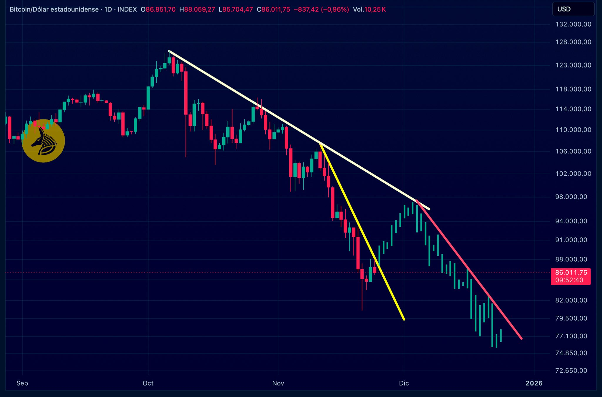 El precio actual de Bitcoin ronda los 87,419 dólares. En la última semana, ha caído aproximadamente 7%, lo que muestra una presión bajista reciente. Al mismo tiempo, acumula pérdidas del 30% desde su máximo histórico de 126,000 dólares registrado en octubre.