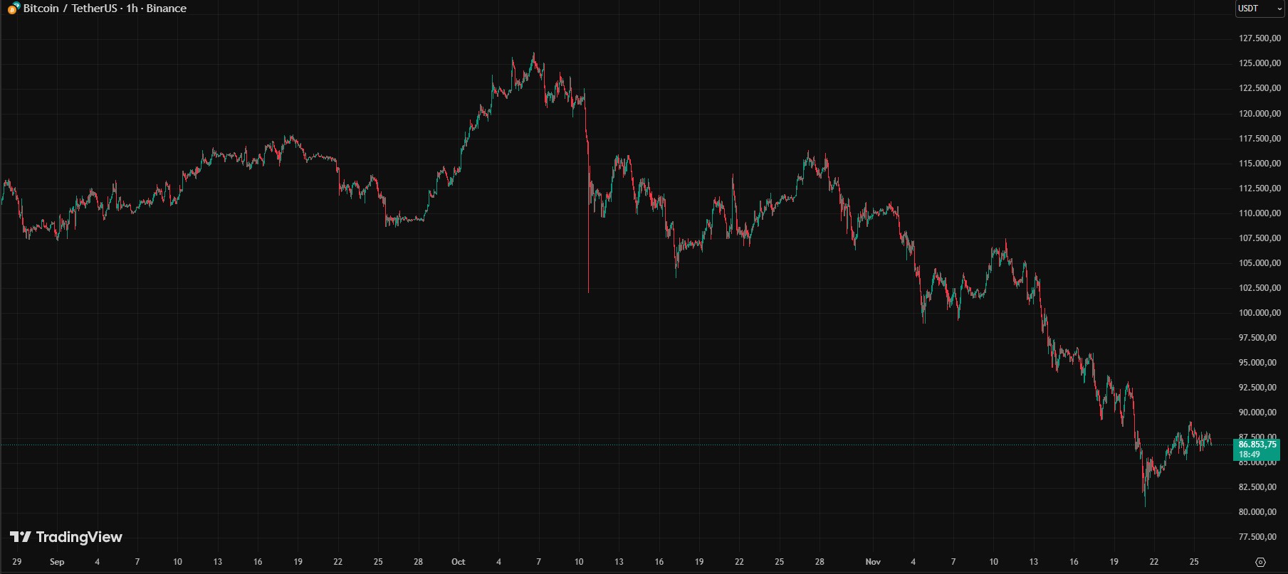 Efectivamente, el precio de bitcoin muestra un descenso sostenido desde inicios de noviembre, con breves intentos de recuperación. Así se aprecia en el siguiente gráfico: