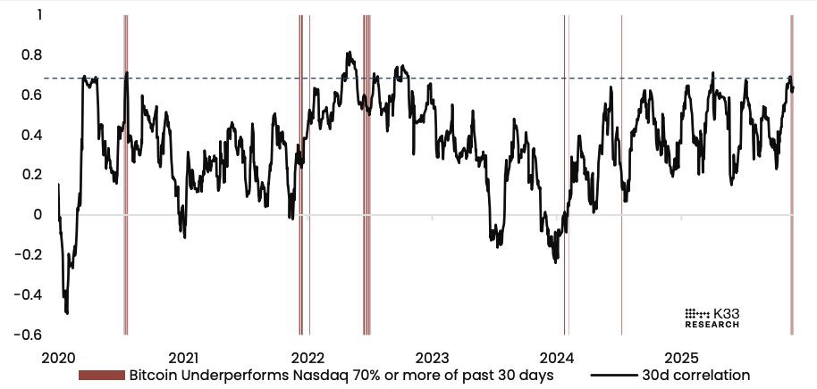 Bitcoin experimentó una caída del 36% desde su máximo histórico, y según K33, el sentimiento del mercado se ha vuelto excesivamente extremo. El analista Kyle interviene para emitir advertencias. BTC quedó rezagado frente al Nasdaq en el 70% de las sesiones este mes, mostrando niveles de debilidad relativos sin precedentes desde 2020. Sin un rebote desde los niveles actuales, esta debilidad podría profundizarse.