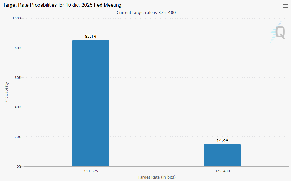 Al menos tres elementos hay a la vista que explican el repunte de BTC y dos de ellos están relacionados con la Reserva Federal. El primero tiene que ver con el aumento acelerado de las posibilidades de un recorte de tipos durante la reunión de política monetaria del 9-10 de diciembre. A menos de 14 días para el encuentro, las probabilidades de recortes son del 85.1%, según el FedWatch del CME Group.