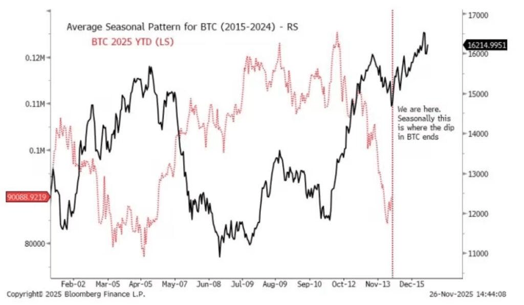 De acuerdo con el análisis de Krinsky, existe una tendencia histórica entre 2014 y 2024 que muestra al BTC tocando fondo alrededor del 26 de noviembre. Posteriormente, la moneda suele experimentar una fuerte recuperación durante las últimas semanas del año. El analista considera que este patrón tiene altas probabilidades de repetirse.