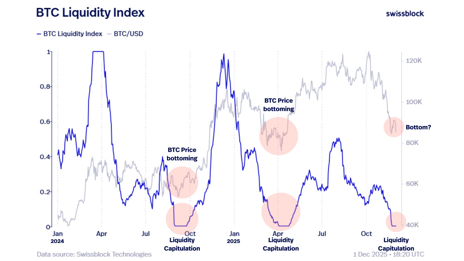 Los analistas de Swissblock, compartiendo el gráfico anterior, declaran que Bitcoin ha entrado claramente en una reversión desde su punto bajo actual. Las tendencias históricas revelan que las crisis de liquidez, seguidas por repuntes que duran solo semanas, a menudo preceden a estos puntos de inflexión cruciales. La liquidez actúa como precursor, con los precios siguiéndola de 1 a 3 semanas después.