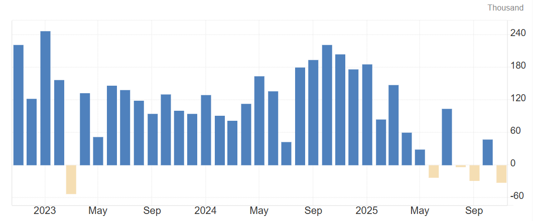La Economista Jefe de ADP, Nela Richardson, confirma las fluctuaciones recientes en el empleo debido a un entorno macroeconómico incierto. Este detalle contradice las declaraciones de miembros agresivos de la Fed que aseguran que no se necesitan más recortes de tasas de interés. Según el Informe Nacional de Empleo de ADP, el empleo en el sector privado disminuyó en 32,000 en noviembre, con salarios aumentando un 4.4% interanual.
