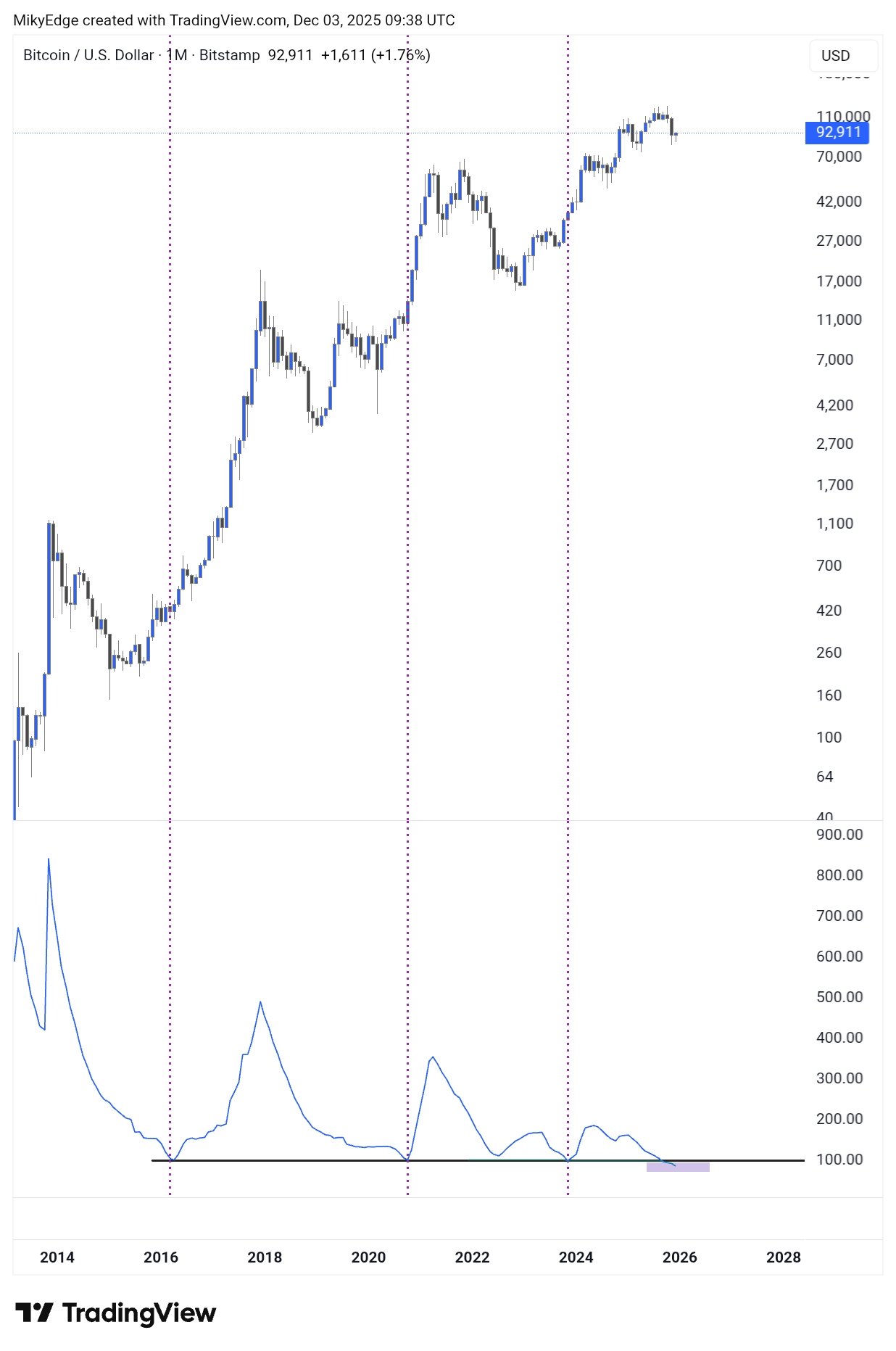 “BTC ha descendido por debajo de su nivel de contracción BBW histórico más bajo (ver gráfico arriba). Tales niveles típicamente anuncian aumentos significativos. ¿Este caso se desviará de patrones pasados?”