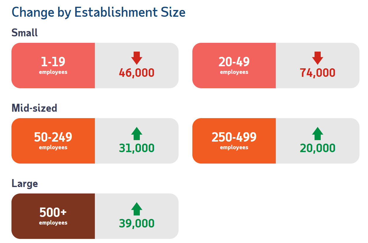 Según el informe, las nóminas privadas no agrícolas sufrieron un retroceso notable, liderado por los despidos en las empresas pequeñas. Las compañías consideradas grandes (de 50 o más empleados) registraron un incremento de 90.000 puestos. En contraste, las empresas pequeñas (50 empleados o menos) recortaron 120.000 empleos.