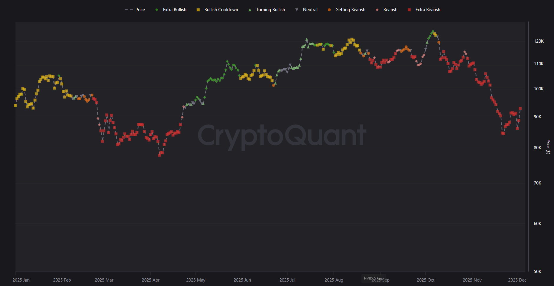 Otro indicador, el Bull Score mapeado al precio, refuerza esta visión. El modelo ha pasado de señales verdes “extra alcista” a principios de año a lecturas persistentes de “bajista” y “extra bajista” en septiembre, octubre y noviembre.