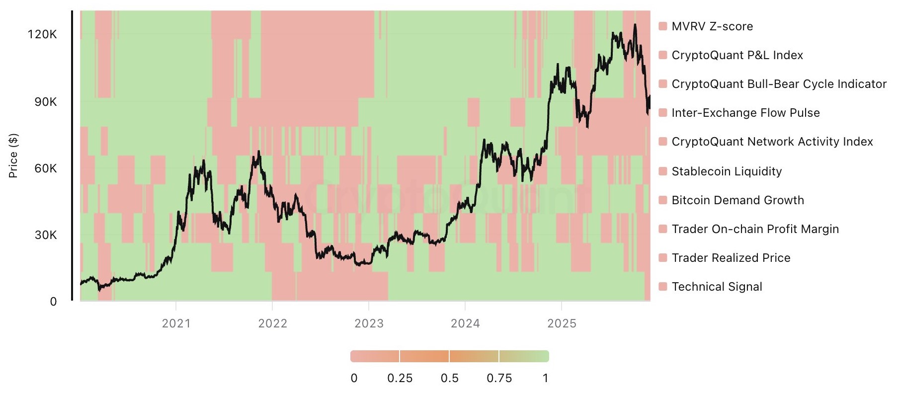 Cada segmento rojo representa momentos en los que los indicadores on-chain y técnicos detectan señales negativas. Ya sea por sobrevaluación, debilidad estructural o presión vendedora.
