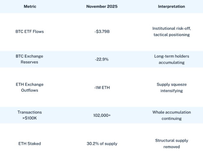 También destaca que más de 102.000 transacciones superiores a USD 100.000 se registraron en noviembre. Esto se interpreta como un «movimiento de capital paciente que acumuló mientras los productos institucionales liquidaban posiciones», según esa firma.