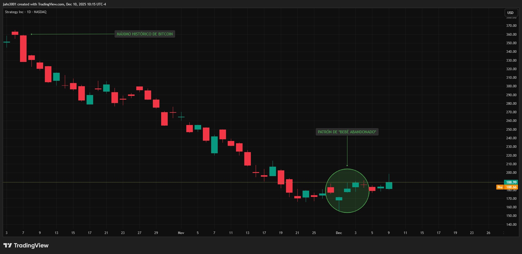 El patrón se conforma cuando un fuerte gap bajista es seguido por una pequeña vela aislada, y posteriormente un gap alcista que deja esa vela «abandonada». La confirmación de esto ocurre cuando el precio vuelve a colocarse por encima del rango previo, algo que MSTR logró el pasado 3 de diciembre.