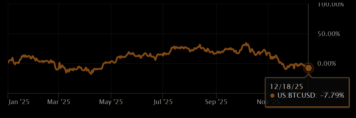 A pesar de los buenos resultados de este año, con múltiples máximos históricos conquistados (aproximadamente 15 rupturas entre enero y octubre), el BTC se prepara para cerrar el 2025 con números rojos. Según datos recolectados por CriptoTendencia, el desempeño de BTC en 2025 (YTD) es de -7.79% hasta este 18 de diciembre.