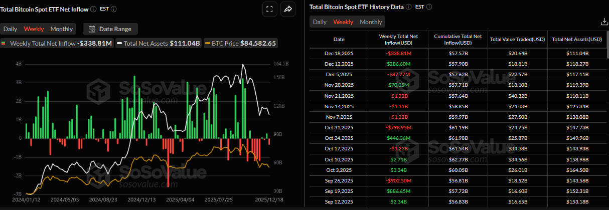La corrección del precio del Bitcoin esta semana fue respaldada por el debilitamiento de la demanda institucional. Los datos de SoSoValue muestran que los ETFs de Bitcoin al contado registraron una salida neta total de 338,81 millones de dólares hasta el jueves, marcando la mayor salida semanal desde el 21 de noviembre y rompiendo la racha de entradas positivas de la semana anterior. Si estas salidas continúan e intensifican, el precio del Bitcoin podría ver una corrección adicional.