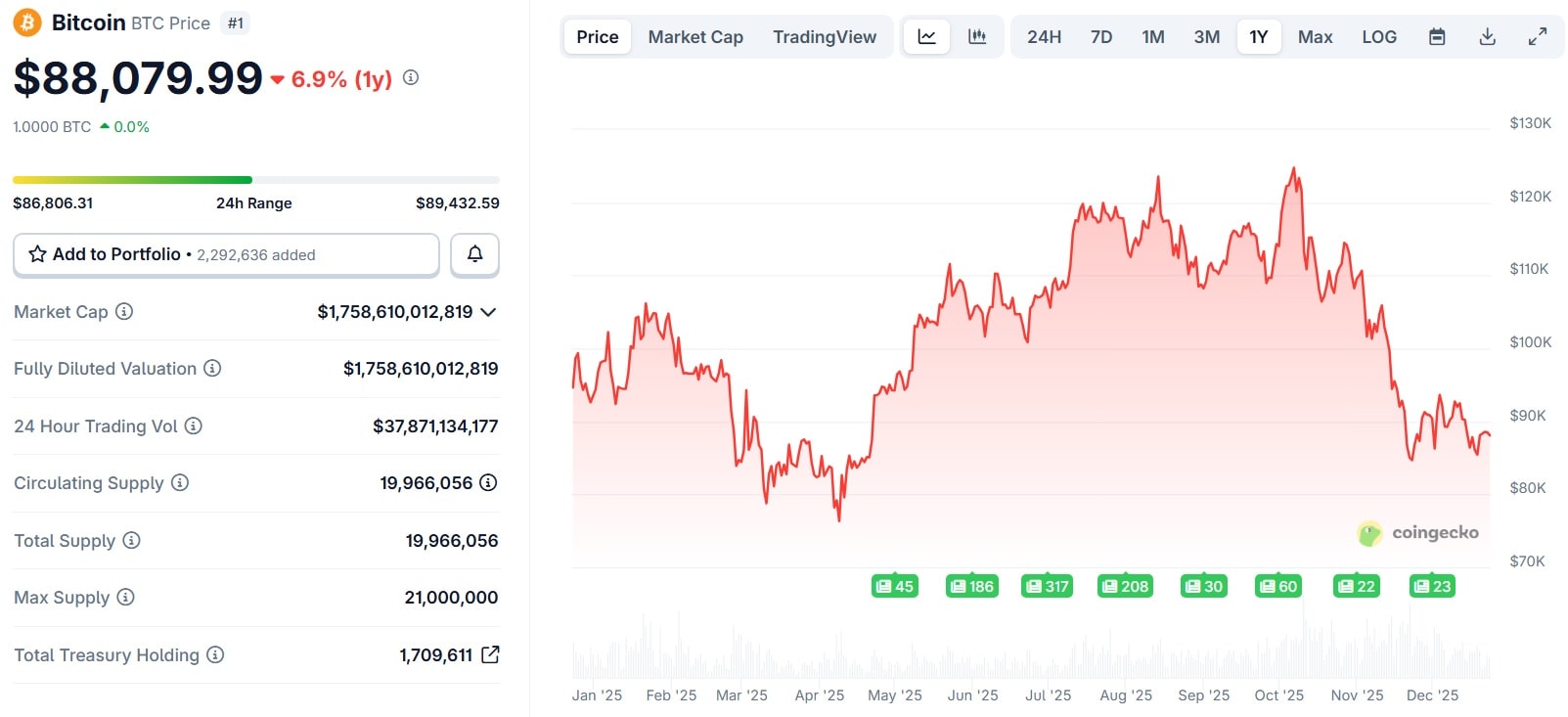 El precio de Bitcoin se situaba al momento de edición en torno a los 88.100 dólares, con una caída de 1,5% en las últimas 24 horas. Sin embargo, esta recuperación marginal con respecto a los mínimos de noviembre no disimula la tendencia bajista: la criptomoneda permanece aproximadamente un 30% por debajo de su pico histórico y cotiza por debajo de los niveles con los que inició el año.