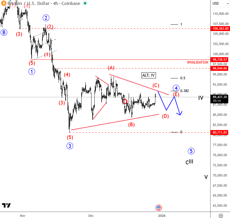 El Bitcoin ha realizado solo tres rallys en forma de ondas desde los mínimos de noviembre, lo que es una de las indicaciones más importantes de que puede haber más debilidad por delante. Debido a las festividades, no es sorprendente que el precio esté actualmente atrapado en un rango, y basándose en la última acción del precio, esto podría estar formando un triángulo en la onda cuatro. Este sigue siendo un patrón de continuación, pero puede necesitar otras subondas D y E antes de que podamos esperar el próximo movimiento a la baja, posiblemente en enero. En ese caso, el precio podría caer de nuevo hacia el área de 80k, o incluso más bajo, dentro de una onda impulsiva A que es claramente visible en el gráfico diario. El nivel de invalidación está alrededor de 99k, y mientras la estructura actual de ondas cotice por debajo de ese nivel, los comerciantes deben permanecer cautelosos y preparados para otro movimiento a la baja en un futuro cercano.
