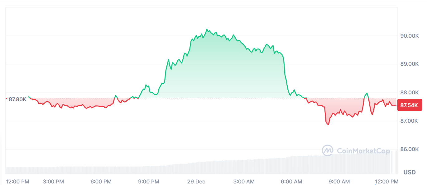 Al momento de redactar esta nota, el precio de BTC se ubica en $87.544, lo que representa una caída del -0,2% en las últimas 24 horas, según datos de CoinMarketCap. Durante la jornada, la moneda alcanzó un máximo local cercano a los $90.300. Aun así, su desempeño sigue siendo claramente inferior al del S&P 500 y de otros activos considerados de reserva.