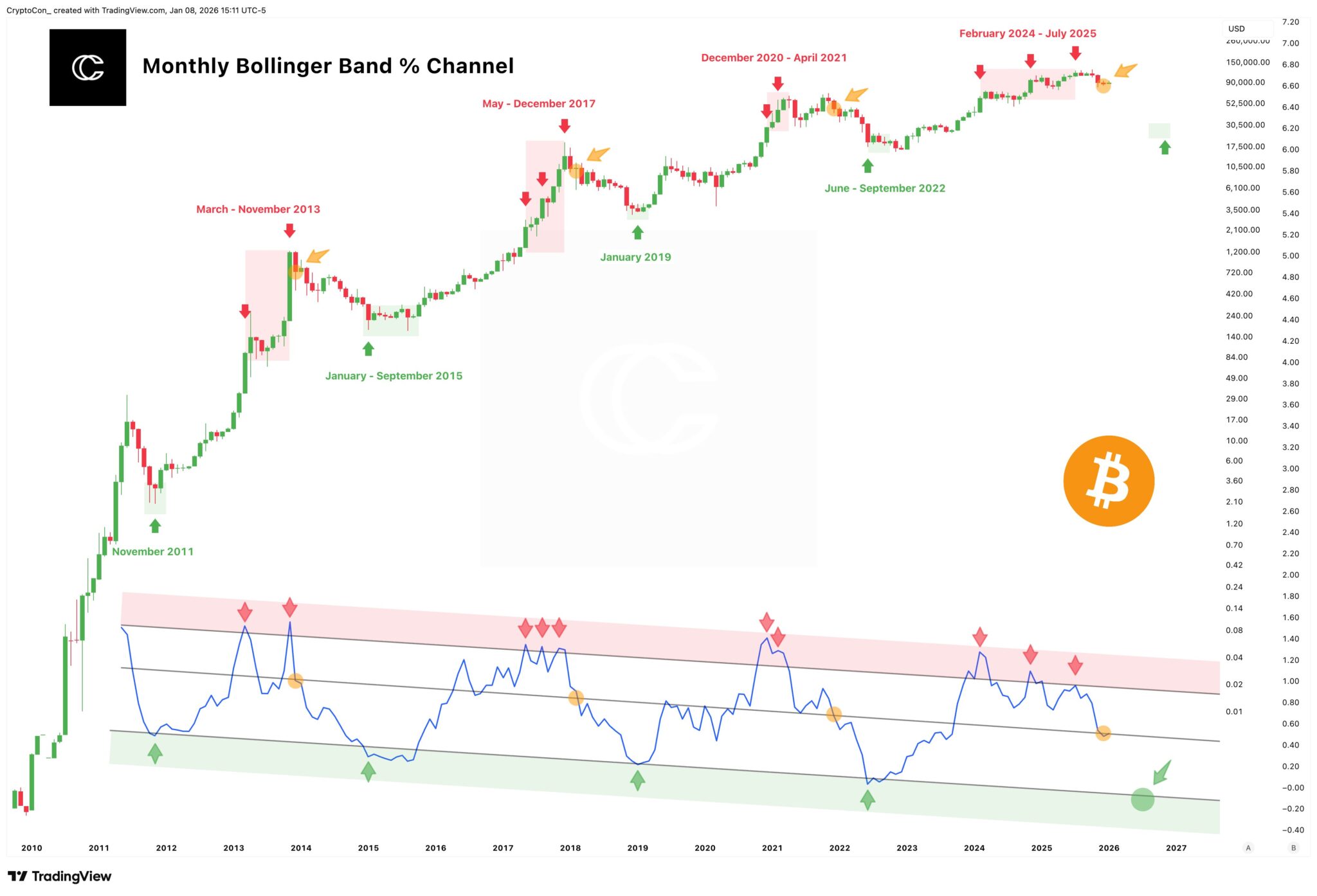 Su análisis se basa en el canal de porcentaje de las Bandas de Bollinger (%b) en gráfico mensual. Este es un indicador técnico clásico utilizado para evaluar el impulso y el agotamiento del precio de bitcoin a largo plazo. Este mide la posición del precio relativo a las bandas: valores por encima de 1 indican sobrecompra extrema (zona superior roja), mientras que valores cercanos o por debajo de 0 señalan sobreventa o suelos de mercado (zona inferior verde).