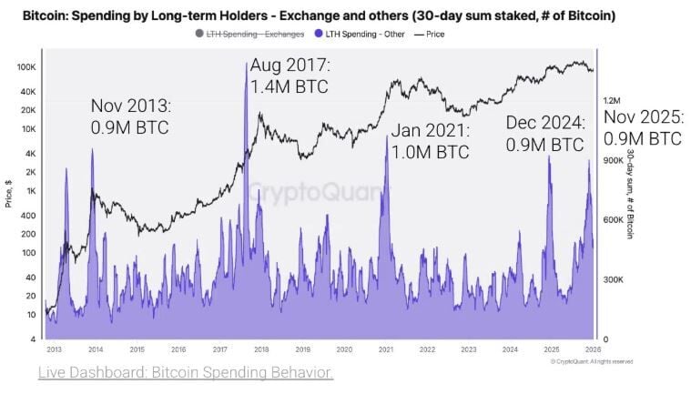 En noviembre de 2025 el gasto en LTH se disparó a 1.55 millones de BTC, debido principalmente a las transferencias internas de Coinbase. No obstante, si se excluyen los exchanges el LTH sigue siendo alto alrededor de 0.9 millones de BTC.