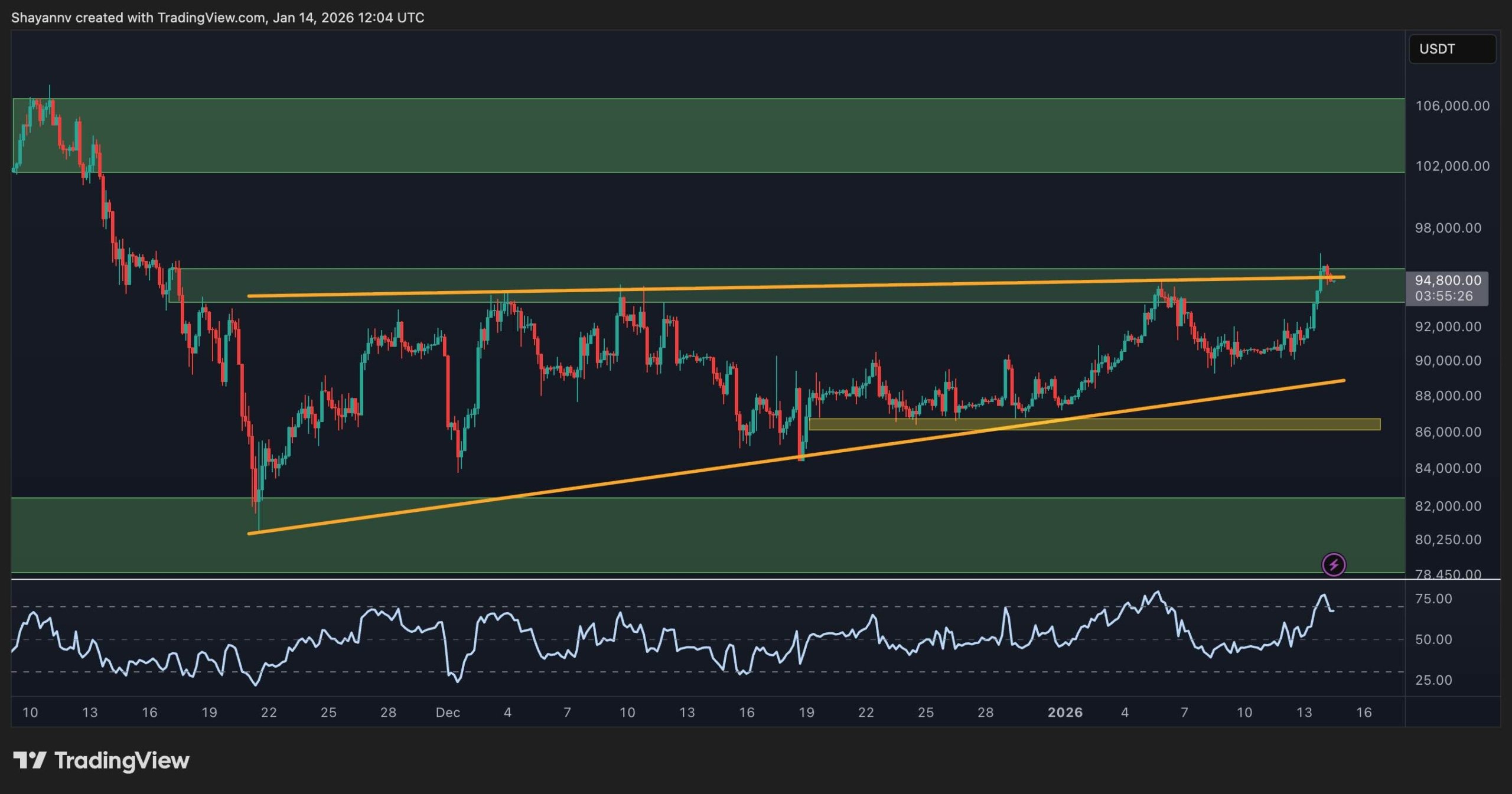 Aquí el mercado está equilibrado: una ruptura sólida por encima de la resistencia horizontal en $95.000 y del límite superior de la cuña abriría espacio hacia la siguiente zona de oferta diaria, justo por encima de $100.000. Por otro lado, un rechazo haría que el precio rote de vuelta dentro del patrón y, potencialmente, hacia el soporte inferior del rango. Por lo tanto, la acción del precio de BTC a medio plazo depende en gran medida de su reacción en el nivel actual.