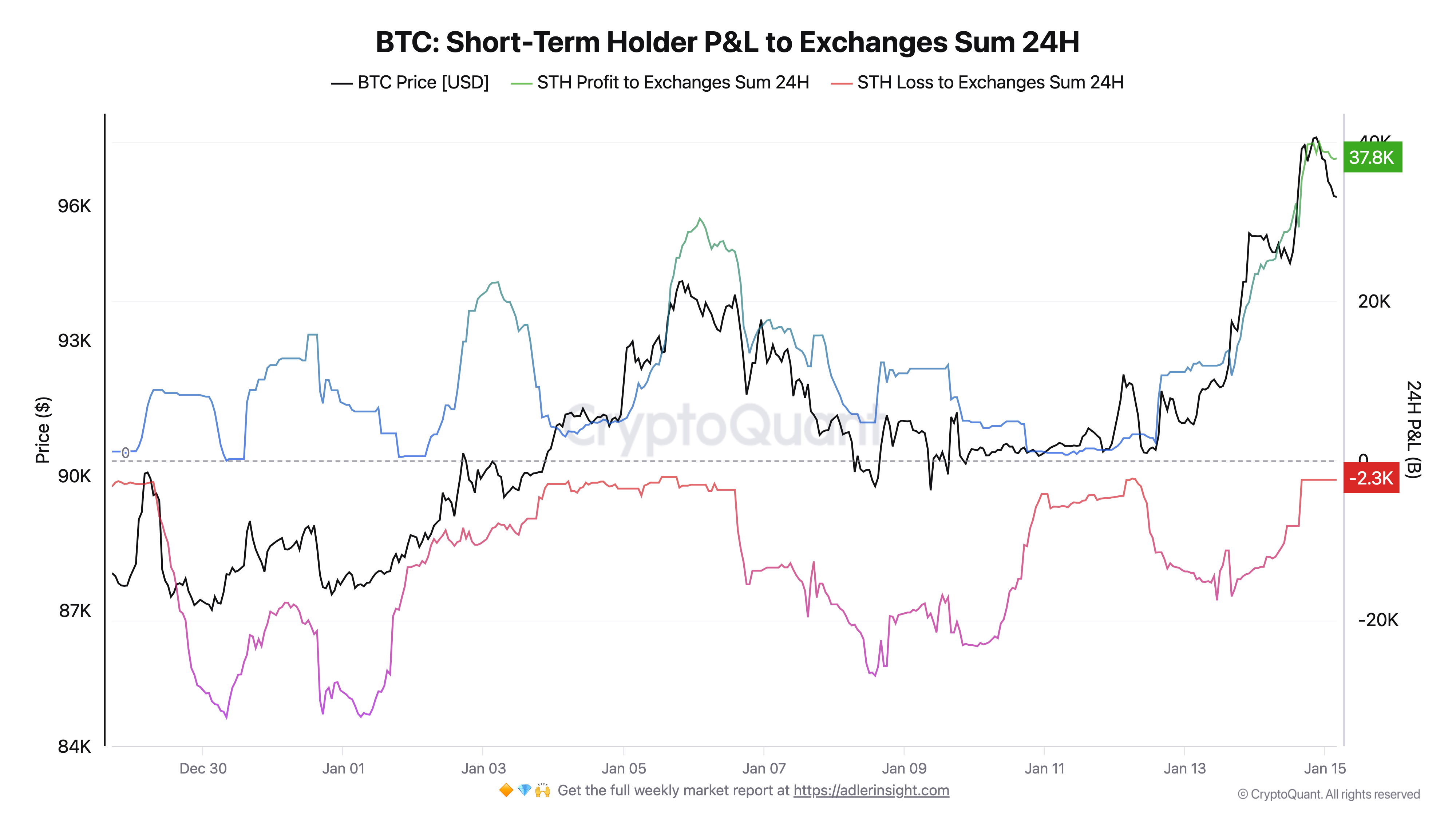 Cuando el precio alcanzó máximos de dos meses, los holders a corto plazo (STH), entidades que mantienen sus posiciones durante un máximo de seis meses, enviaron 40.000 BTC a exchanges en un periodo de 24 horas.