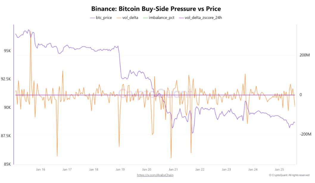 El delta de volumen alcanzó unos modestos 59,6 millones de dólares en Binance durante la caída, lo que indica solo un ligero dominio de los vendedores sobre los compradores.
